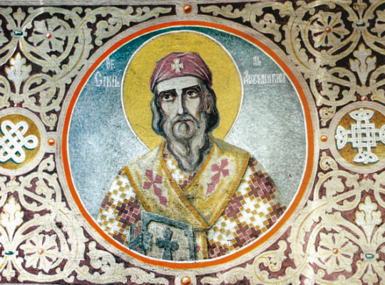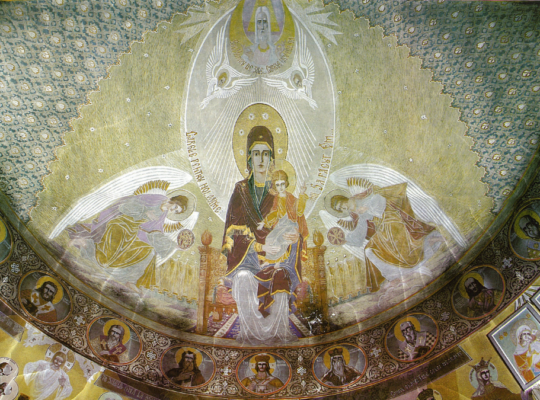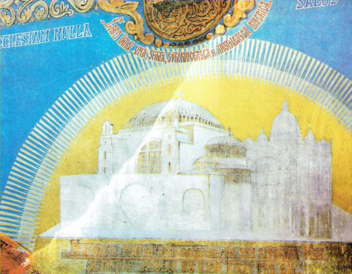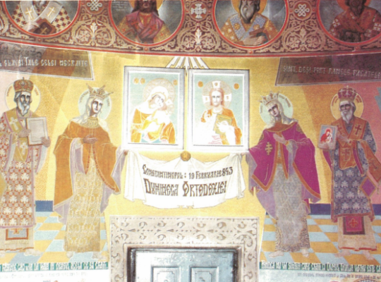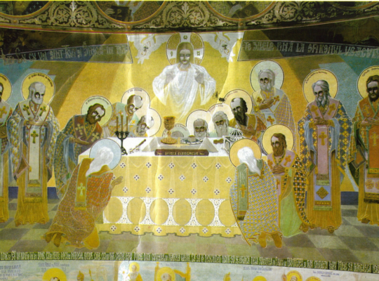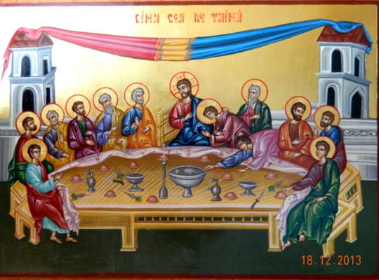 „Icoanele praznicale: Deasupra uşilor împărăteşti şi în centrul iconostasului, mai mare decât toate celelalte din acelaşi rând, se află Cina cea de Taină, reprezentată astfel: împrejurul unei mese circulare – ca o adevărată masă a tăcerii şi a cuvântării – stă Mântuitorul Iisus Hristos înconjurat de cei doisprezece sfinți ucenici şi apostoli, şezând cu toții pe scaune, simbolizând cele douăsprezece scaune de la „înnoirea tuturor lucrurilor” (Matei 19,28). Pe sfântul disc se află şapte pâini sau prescuri cu pecetea IS HR NI KA, iar lângă acesta un sfânt potir euharistic. În dreapta Mântuitorului Hristos se află Iuda vânzătorul, strângând punga …