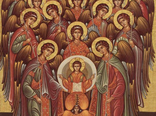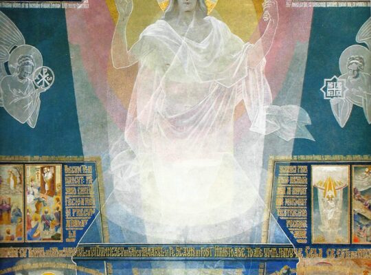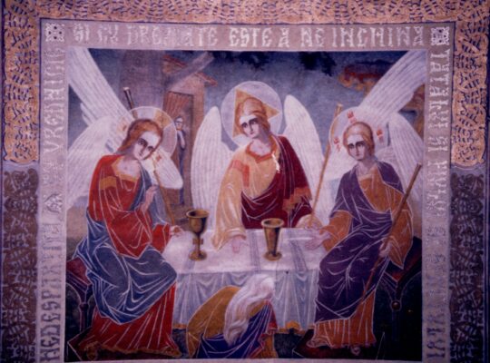 „De la stânga la dreapta: Întâmpinarea Domnului: În planul depărtat al templului din Ierusalim, urcă pe scările acestuia, dreptul Iosif şi Sfânta Fecioară Maria cu Pruncul Iisus, iar în planul apropiat o vedem pe Maica Domnului, pe dreptul Iosif şi pe dreptul Simeon cu Pruncul în brațe, împovărat şi odihnit deopotrivă, în apropierea cărora se află şi sfânta proorocită Ana. Pe sfânta icoană sunt cuvintele dreptului Simeon de la vecernia vieții sale: „Acum slobozeşte pe robul Tău, Stăpâne, după cuvântul Tău în pace. Că văzură ochii mei mântuirea Ta pe care ai gătit-o înaintea feței tuturor popoarelor, lumină spre descoperirea …