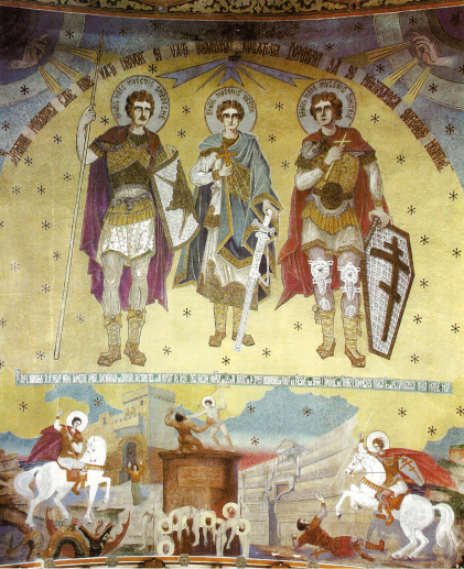 „În partea dreaptă a absidei sunt pictați cei trei sfinți mucenici militari, ca tineri ostaşi, stând în picioare cu capetele descoperite: