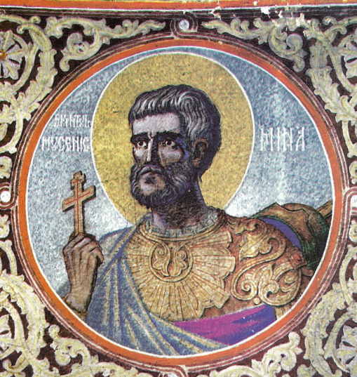 „Sfântul mucenic Mina, cu crucea în mâna dreaptă”.