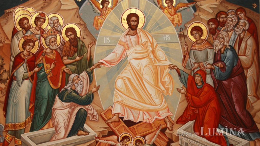 De remarcat este dreapta lui Adam întinsă spre dreapta însângerată a Mântuitorului Iisus Hristos, care calcă peste porțile zdrobite ale iadului. Pogorârea la iad este deopotrivă o ieșire din iad, pentru că unii drepţi ies din morminte. Lumina lui Hristos împrăştie întunericul iadului. Adam şi Eva, îmbătrâniți și osteniți, se odihnesc în genunchi pe noul țărm al veşniciei sau tărâm al învierii„.