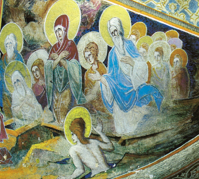 În iad – tărâm despicat de cutremur – stau în picioare sau ies din mormintele închisorii iadului, drepții Vechiului Testament, astfel: la dreapta Domnului, sfântul Ioan Botezătorul şi Înaintemergătorul, având aripi de înger în trup”, binecuvântând, vestind și pregătind Calea Celui ce este,,Calea, Adevărul şi Viața”. Înapoia lui Adam se află un grup de drepți, între care se disting: proorocul, psalmistul şi împăratul David cu harfa în dreapta sa şi Psaltirea în stânga, proorocul Samuel cu cornul cu untdelemn, împărăteasa Estera și alții. În stânga Domnului şi înapoia Evei, sunt drepții Ioachim şi Ana şi alţi sfinți.