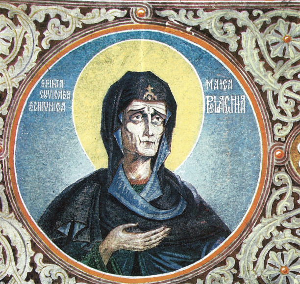 Sfânta cuvioasă schimnică Maica Pelaghia, acoperită pe cap, cu trupul ascetic, uscat, topit şi îmbătrânit, sprijinindu-şi lacrimile cu mâna dreaptă.