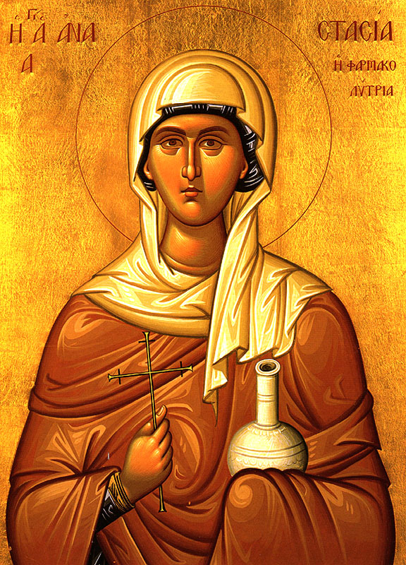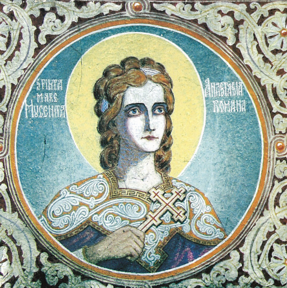 Sfânta mare muceniță Anastasia Romana, cu părul capului împletit şi cu cruce în mâna dreptă.