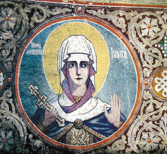 Sfânta mare muceniță Iulita, acoperită cu o mahramă albă, ține crucea în mâna dreaptă.