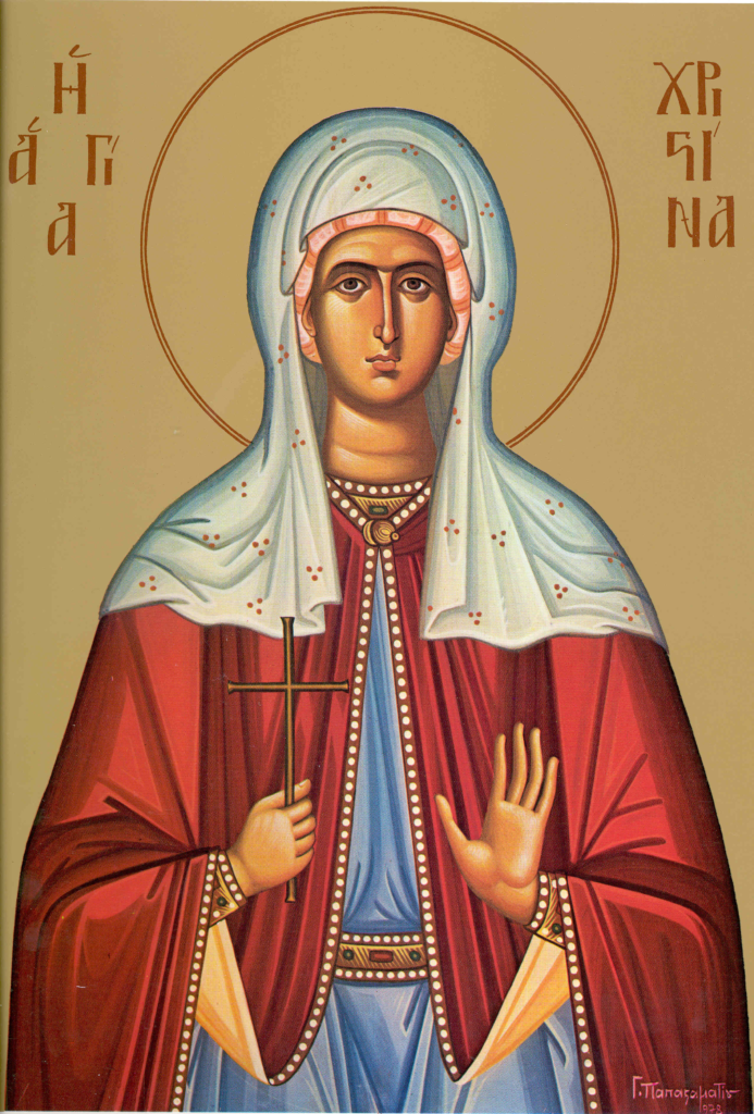 Sfânta mare muceniță Cristina, acoperită pe cap, cu crucea în mâna dreaptă.