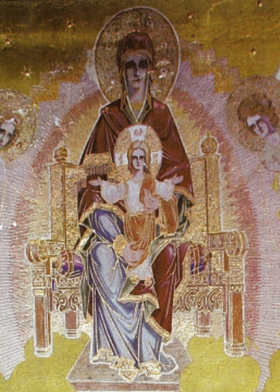„Pe peretele absidei, în partea dreaptă spre altar citim cuvintele: „Prea Sfânta Născătoare de Dumnezeu(OɛOTÓKоç), numirea dogmatică dată Maicii Domnului de către Sinodul III ecumenic împotriva ereziei lui Nestorie”. Pe un fond albastru de cer înstelat, pe un tron auriu în nor şi învăluită în nimb luminos, şade Maica Domnului îmbrăcată în acelaşi veșmânt roşu închis și pecetluită cu câte o stea pe umeri şi pe frunte, ținând pe Pruncul Iisus Hristos în poală și sprijinindu-L cu brațele sale. Mântuitorul Iisus Hristos, sprijinit de bratele Maicii Sale, îşi deschide primitor mâinile, ca mai târziu pe sfânta Cruce. Tronul este străjuit la dreapta de către un înger și de către sfântul apostol Petru cu sfânta Evanghelie închisă, iar la stânga se află un alt înger dimpreună cu sfântul apostol şi evanghelist Ioan, ,,ucenicul iubit” al Domnului și al Maicii Domnului, cu o Evanghelie deschisă, pe care sunt scrise următoarele cuvinte din prologul Evangheliei a patra: „Şi cuvântul trup s-a făcut, iar câți L-au primit, le-a dat putere să fie fiii lui Dumnezeu” (Ioan 1,14 şi 12). Dedesubt, străjuiți la mijloc și în cele două laturi de oştirea creştină bizantină, înarmată cu sulițe, sub zidurile Efesului ce se zăresc în planul îndepărtat, având în mijloc pe tron pe împăratul Teodosie al II-lea, care ține în mâna dreaptă o cruce-sceptru, sunt sfinții Părinți membri ai sinodului III ecumenic, şezând pe tronuri. Sub tronul împăratului scrie EΦEΣ 431. În primul rând, toți sinodalii țin în mână câte o Evanghelie închisă. Al doilea din dreapta împăratului, sfântul Chiril al Alexandriei, are un sul pe care scrie: „Femeie înveșmântată cu soarele”(Apocalipsă 12,1).