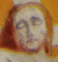 În partea dreaptă, pe Crucea treflată de lemn, cu ornament în raze la intersecția brațelor sfintei Cruci, îl vedem pe Mântuitorul Iisus Hristos răstignit, într-un mod cu totul unic, aparte și genial. [din păcate nu după Sfânta Tradiție. Numai un geniu al răului, poate dori aceasta, și să reușească a face pe oameni să se închine lui, crezând că se închină lui Hristos – n.n.] Domnul Iisus Hristos [în realitate, după cum vedem în tablou, Arsenie Boca – n.n.] privește senin, aproape zâmbind, [vă dați seama ce gravă abatere? Mântuitorul, pentru a ne vindeca toate suferințele, nu a lăsat firea